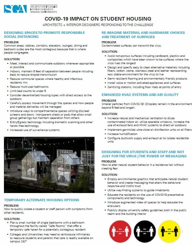COVID-19 has suddenly forced architects and academic institutions to re-imagine student housing in both in short-term alternative options as well as long-term challenges. Common areas, lobbies, corridors, elevators, lounges, dining and bedroom suites are the most contagious because that is where students congregate. How to make these spaces safe?