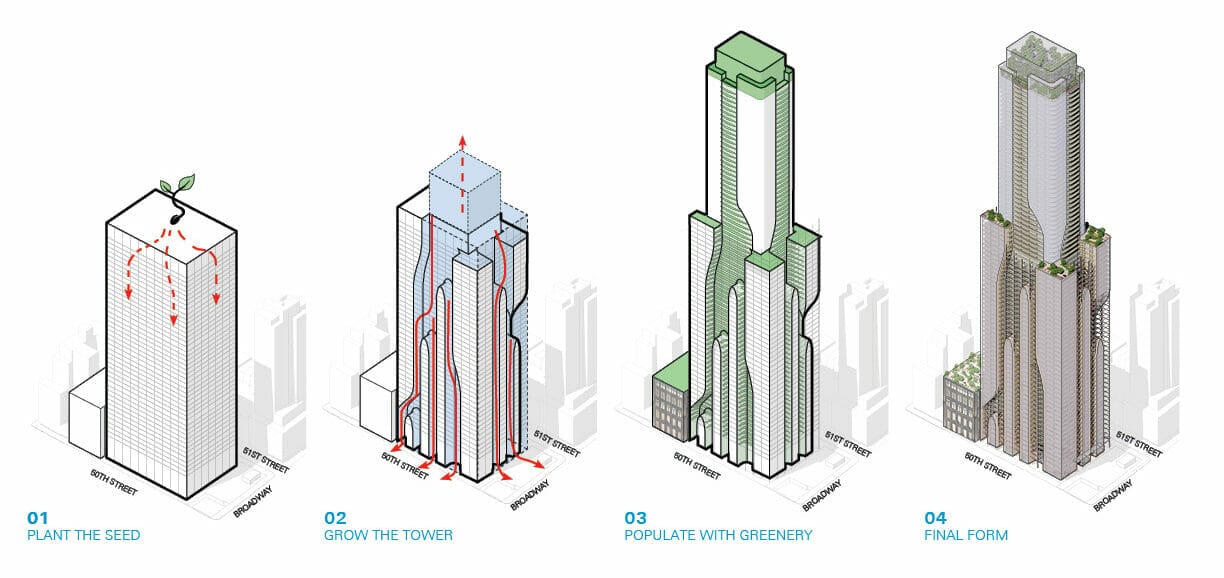The existing building’s stark, stoic form acts as a blank canvas on which designers are able to realize a dynamic, flowing figure; dramatically reimagining the property’s presence on Broadway and its visibility throughout the five boroughs.