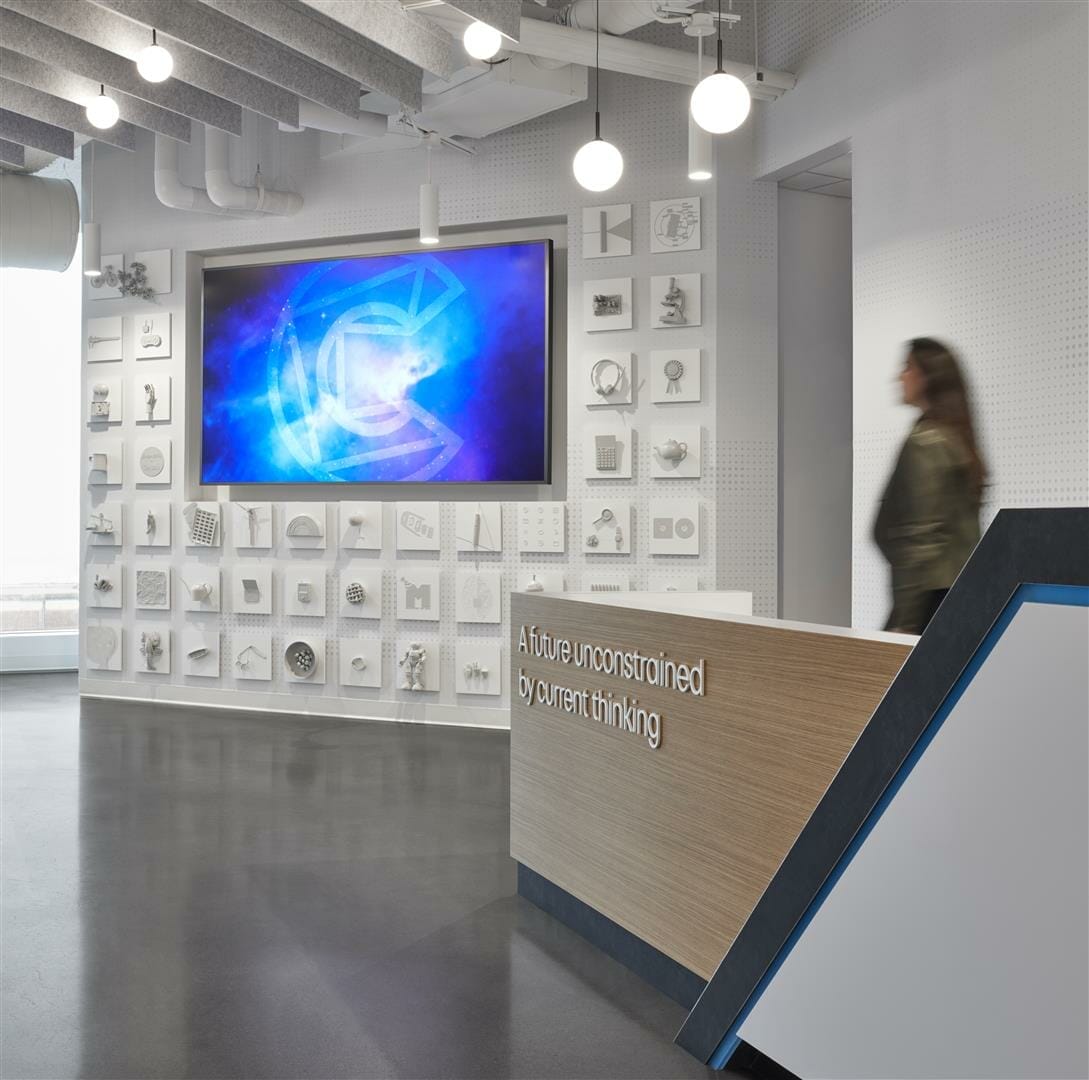 This design experience included a light reveal in the elevator lobby that leads to the reception area, where a wall with a digital display is surrounded by hand-selected artifacts that reflect Cambridge Consultants’ long-standing history and rich company culture.