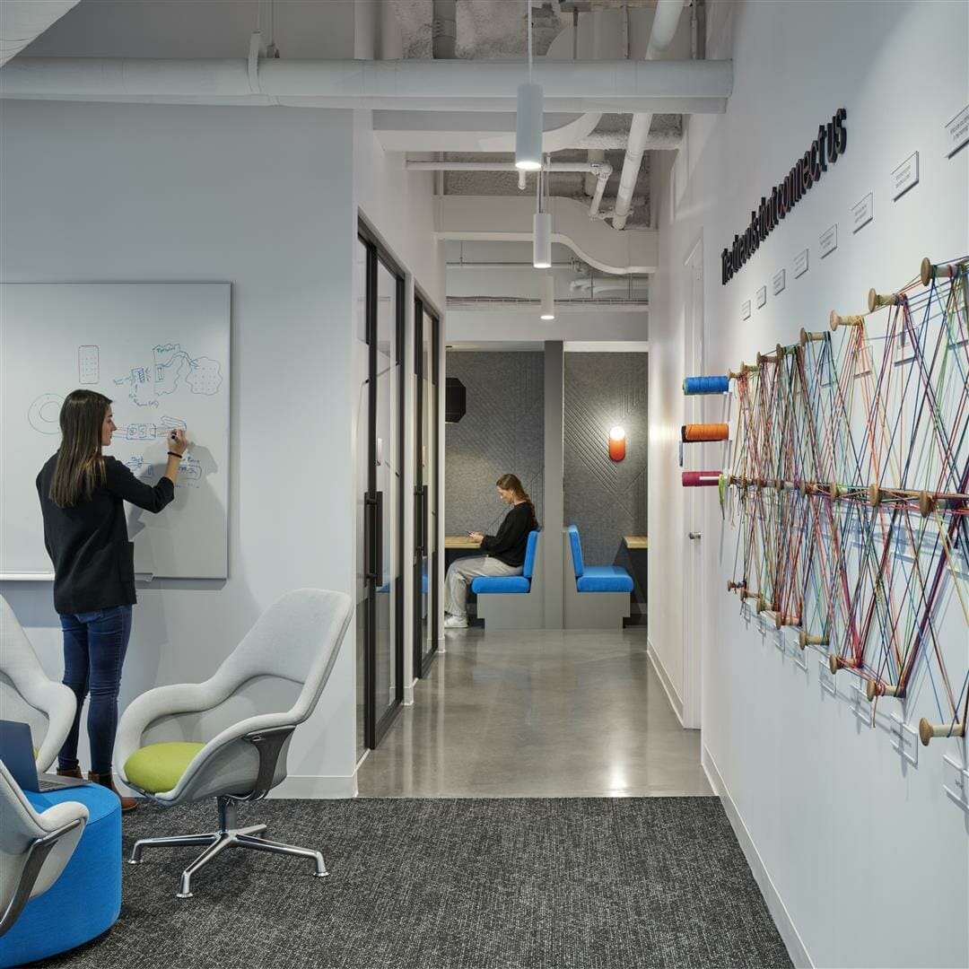 To attract Cambridge Consultant employees back into a new office after COVID lockdowns, SGA designed a space that ensured employees felt comfortable transitioning from home to the office. A greater variety of settings is now the norm, with collaborative meeting rooms that have integrated team technology, such as audiovisual equipment and streamable whiteboards.