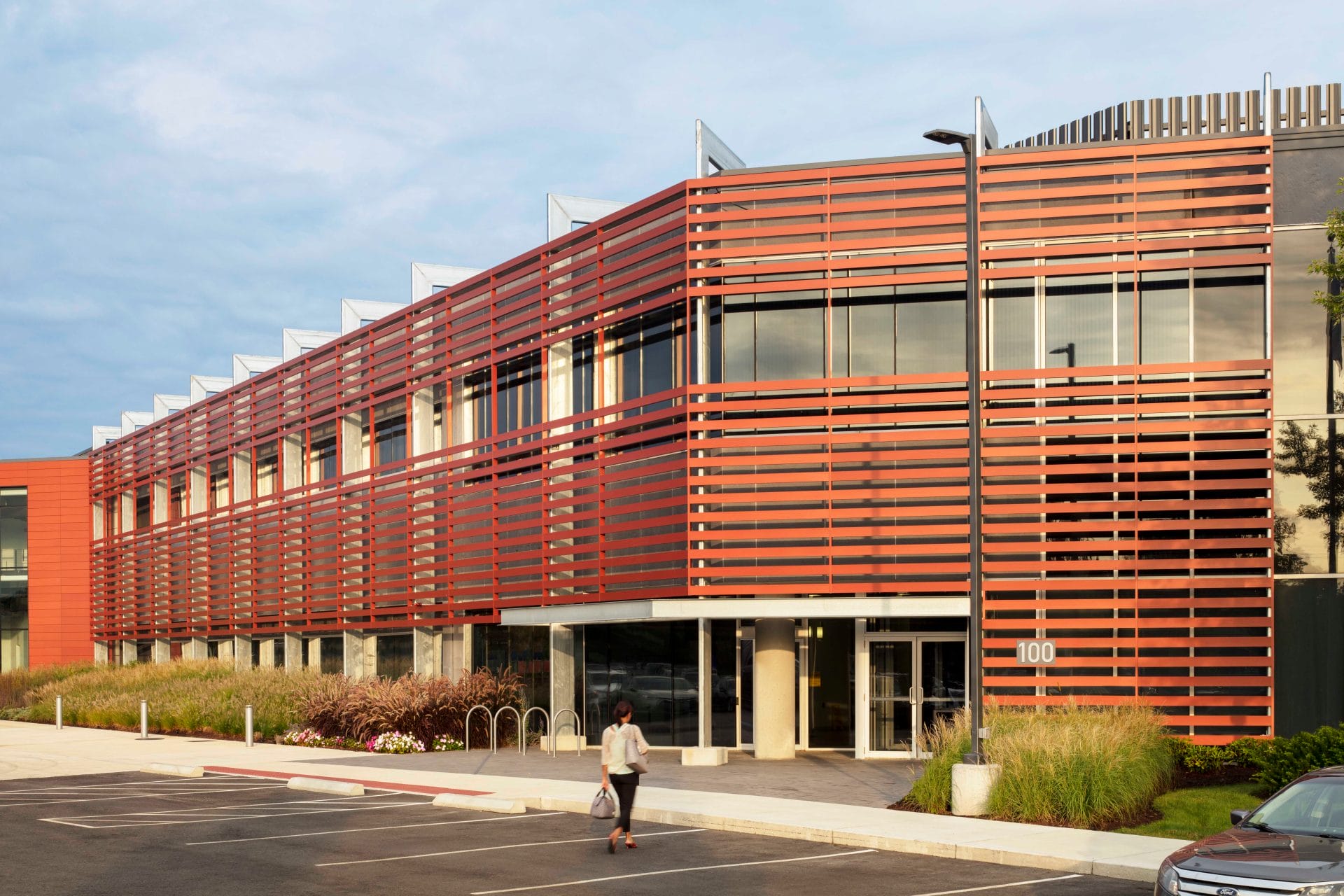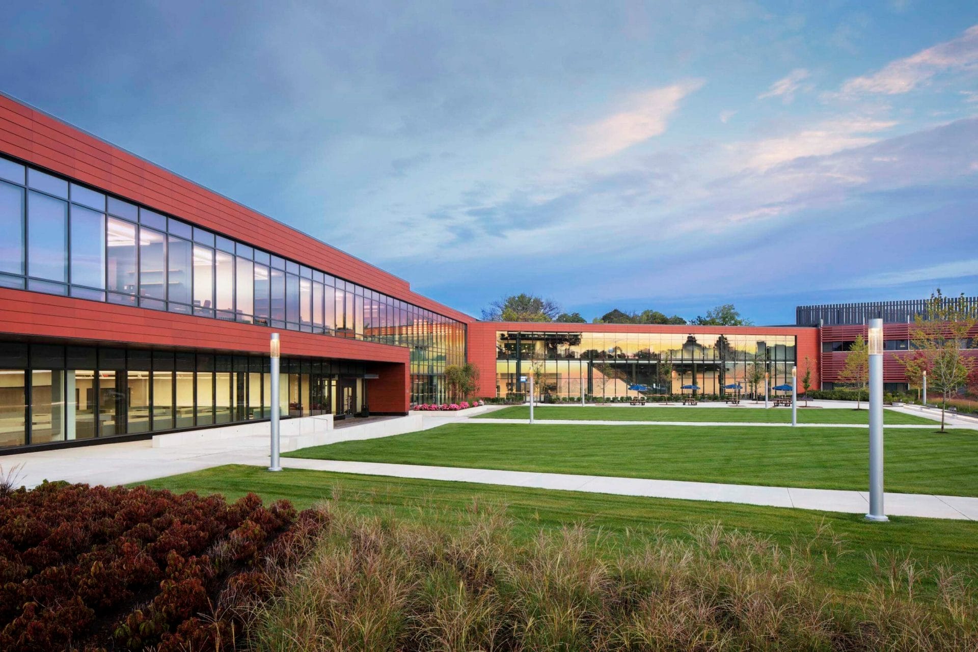 A multi-story “link” connects the new space to the existing building, and additional site improvements create an active, unique campus setting in Lowell, MA.