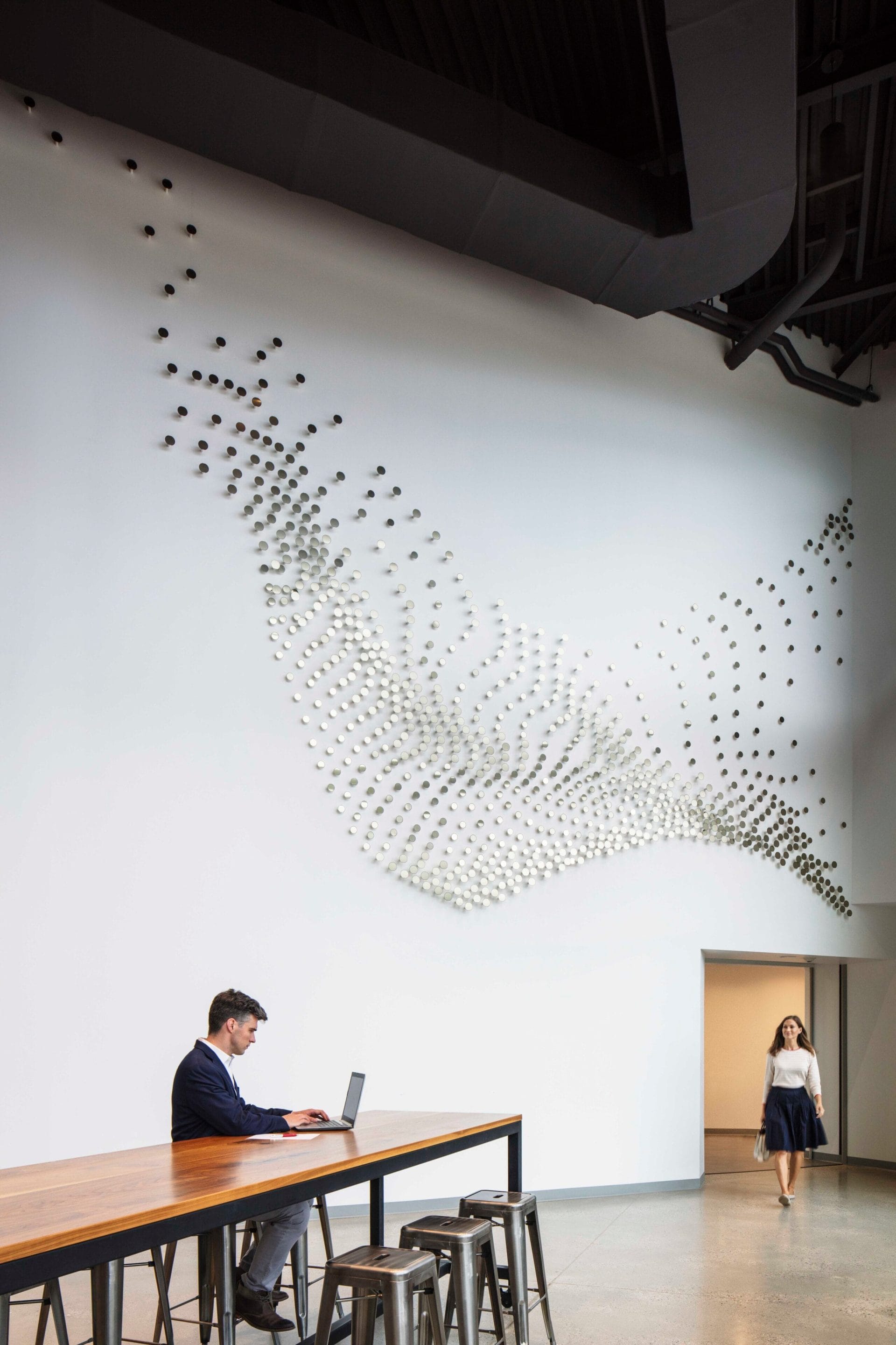 A two-story cafe wall boasts a three-dimensional sine wave built from over 400