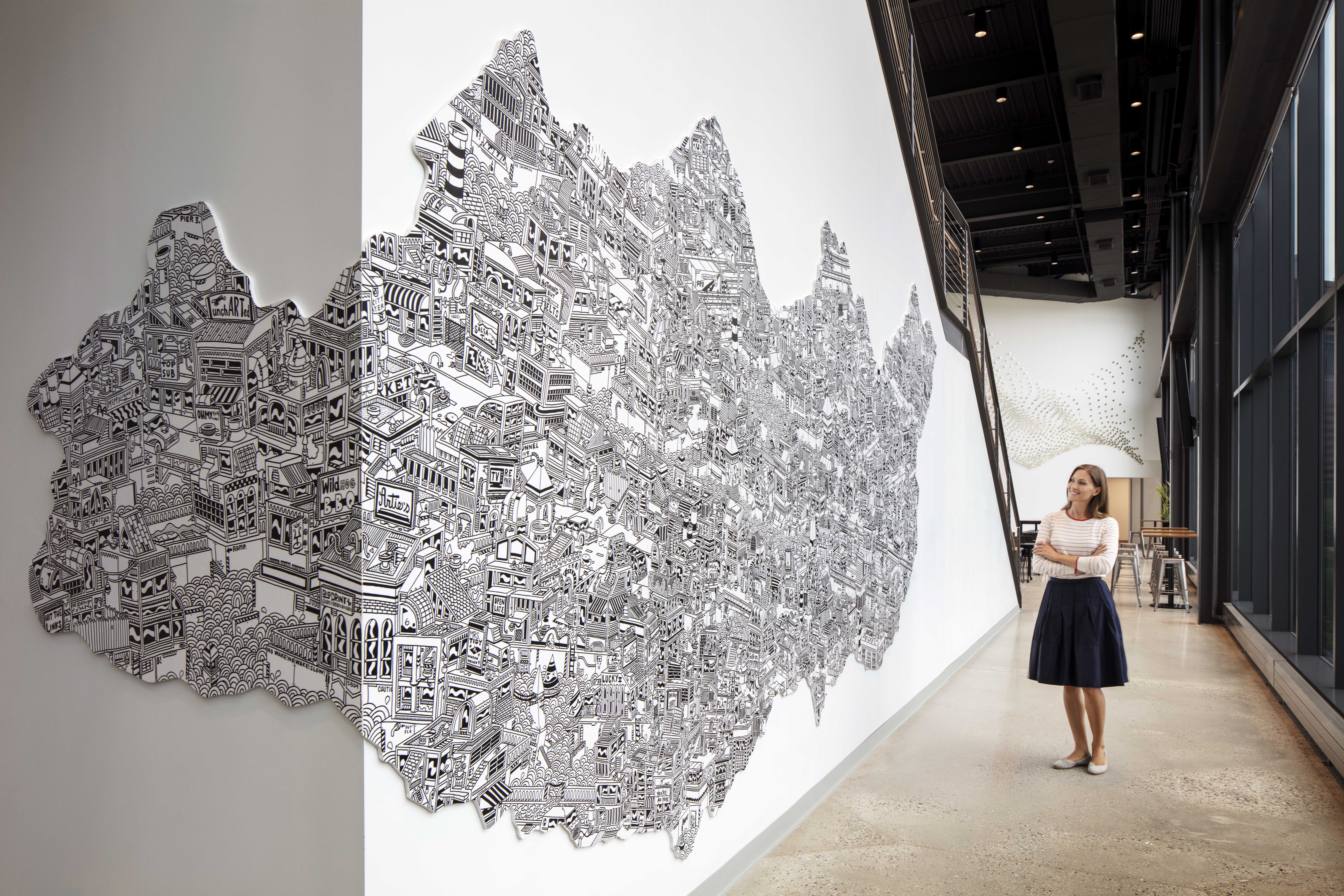 A two-story cafe wall boasts a three-dimensional sine wave built from over 400