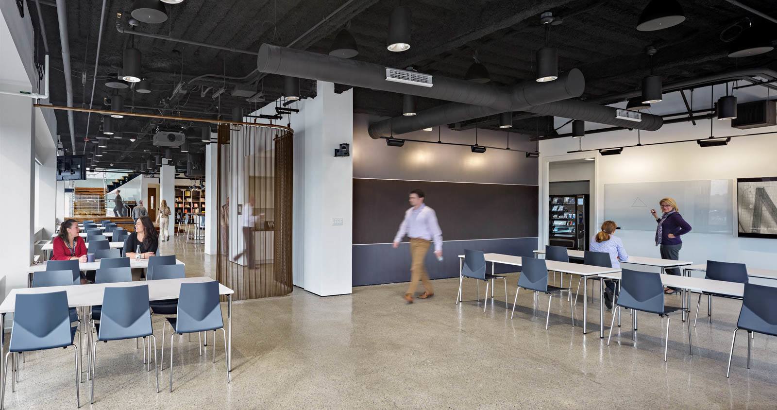 This brand-infused facility features an open floor plan, collaborative areas, integrated technology, and a pantry area that accommodates “Town Hall” employee meetings. Since moving into their new office space, the company is experiencing increased collaboration and flexibility.