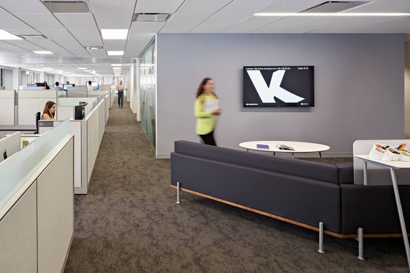 With the new space, Monotype transitioned from high-walled cubes and private offices to open workstations with shared collaboration zones.