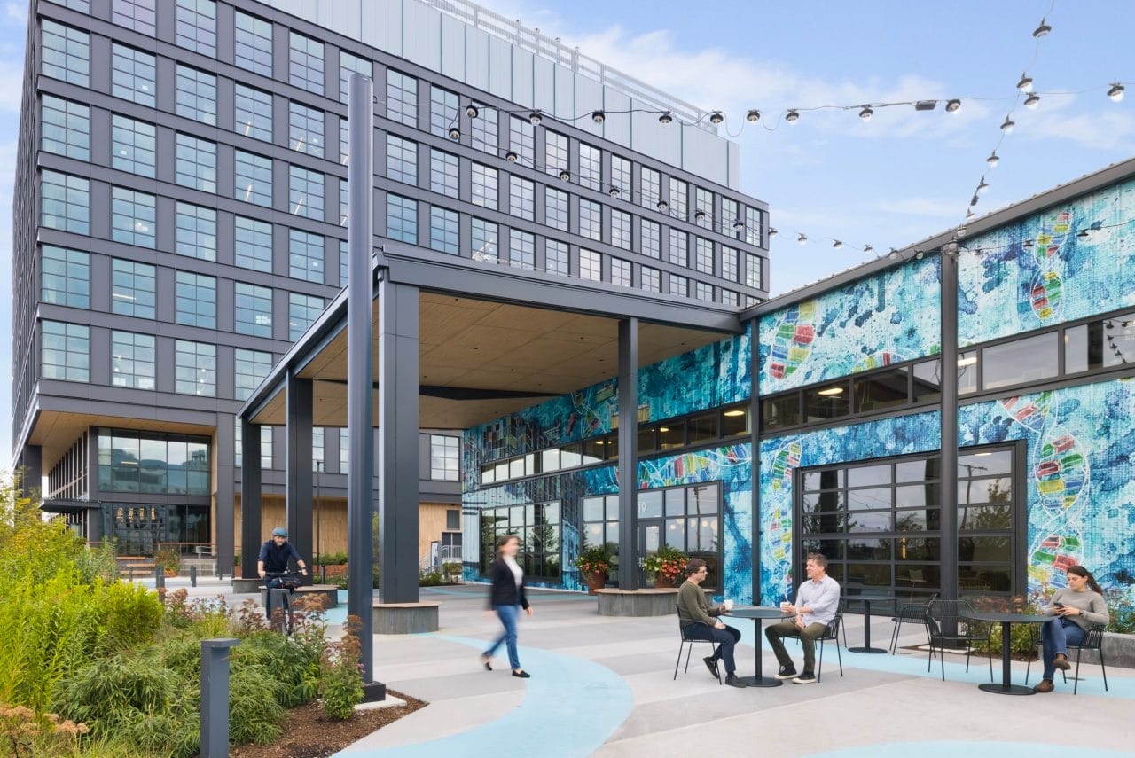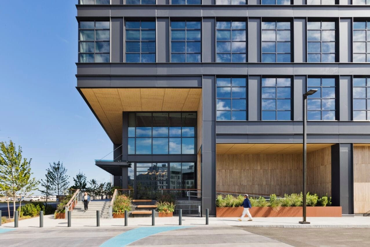 Parcel O was conceived as a state-of-the-art research and development (R&D) facility, contributing to the emerging neighborhood context and delivering a best-in-class experience for its tenants. The façade combines materials like steel and concrete, with wood finishes at the entry creating a warm and inviting contrast to the industrial elements. The transparency at the top of the structure showcases lab equipment, reinforcing the industrial tone and establishing a sense of connection to the work happening inside. The building’s raised front porch, planned for flood resilience, enables an inviting pedestrian experience and creates a dynamic transition between the public sidewalk and the building’s entry. This entry also incorporates dry-proofing measures, such as elevated outlets and flood gates, to further enhance durability against climate-related water challenges.