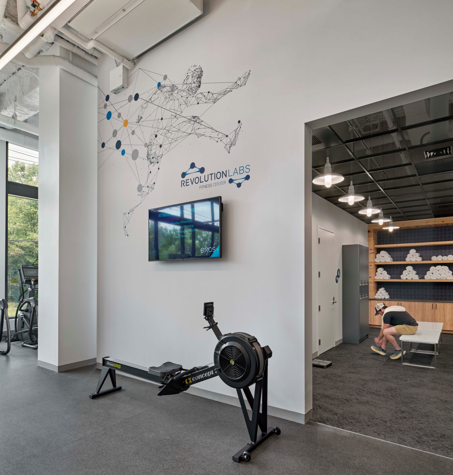 To encourage the active use of this lifestyle amenity space, Revolution Labs and SGA have realized a modern fitness facility that is staffed to meet the needs of tenants and their employees. Equipped with a locker room, free weights, aerobic machines, and space for ground work–the fitness facility provides its users with a seamless transition between physical and mental work. Allowing employees to execute on personal and professional goals side-by-side. Single-user Gender Neutral shower rooms have been integrated to support inclusivity within the fitness space.