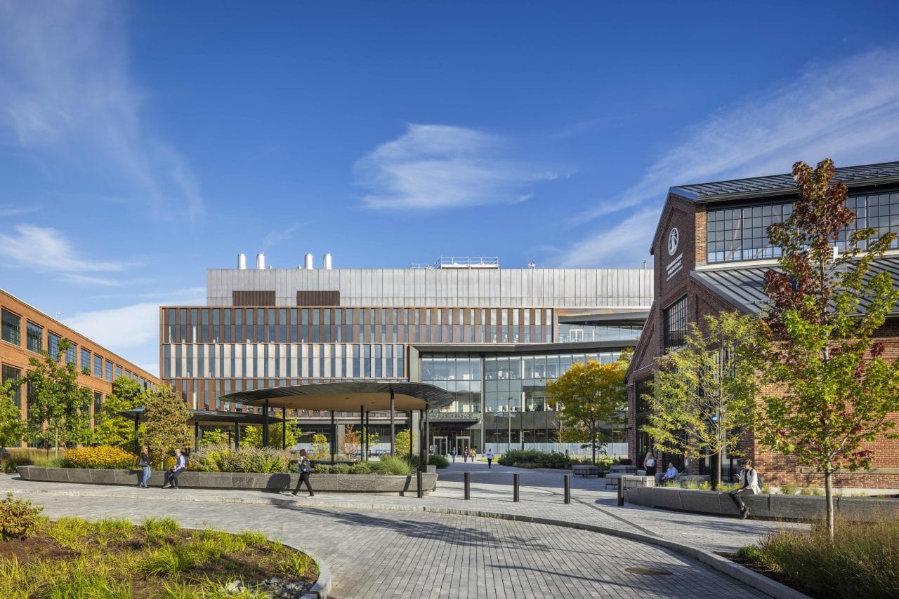 500 North Beacon Street celebrates the rich history of the campus while injecting the site with a contemporary aesthetic. The new office and research laboratory facility, which is LEED Gold certified and targeting Fitwel certification, consists of two main volumes: a four-story structure clad in vertical copper fins and a lower glass volume featuring a large fourth-floor terrace.