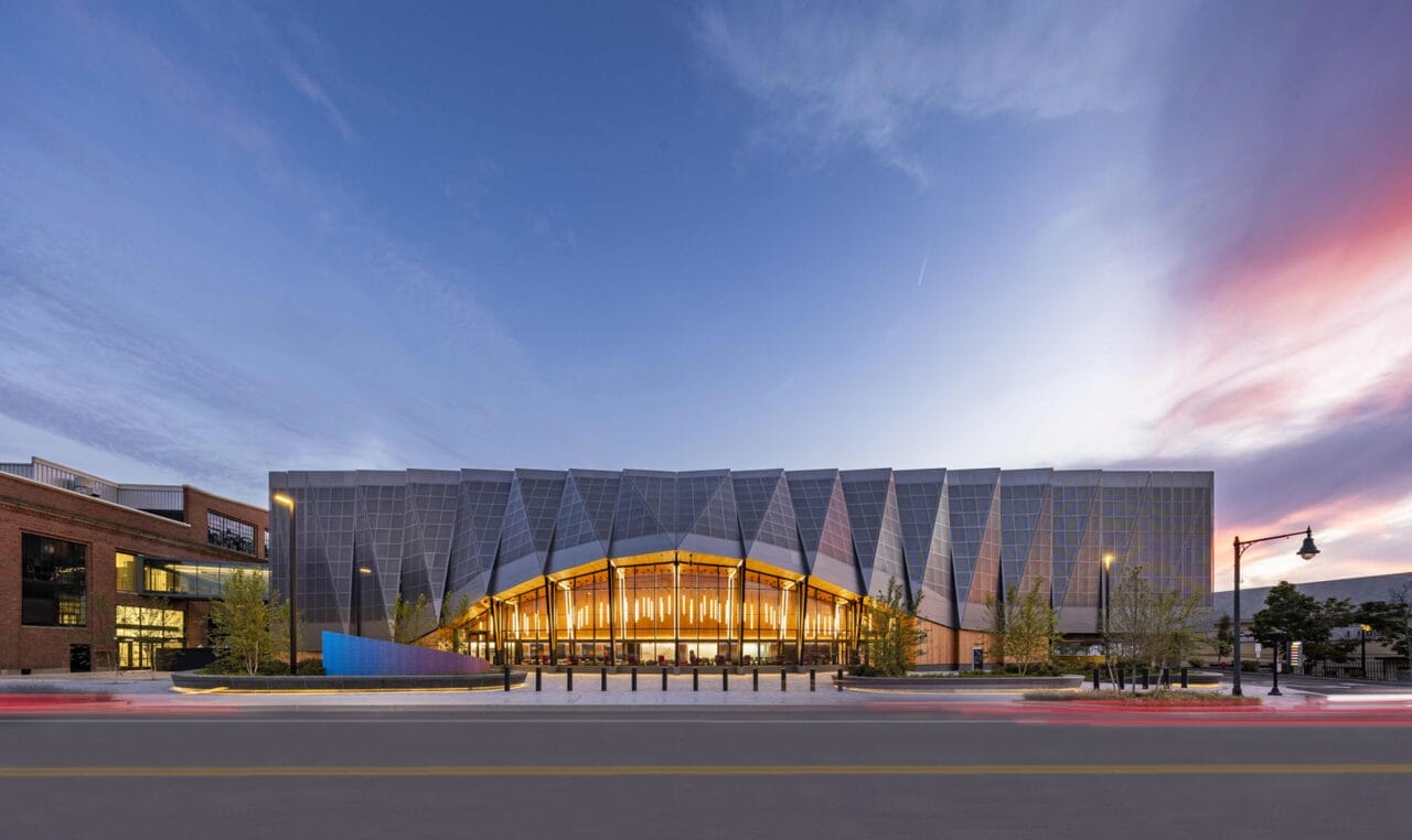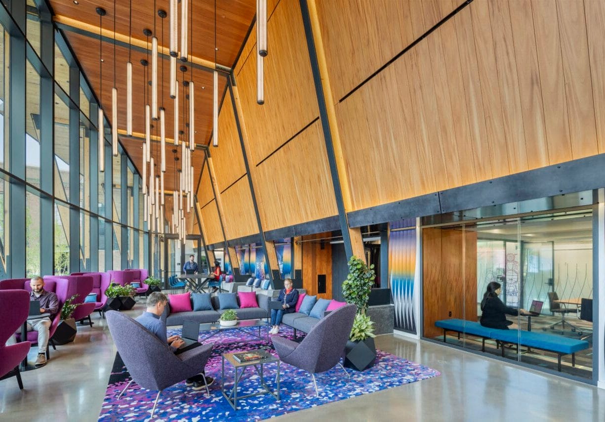 The exterior envelope of the building is defined by a perforated aluminum mesh canopy that doubles as an open rain screen. It is supported by a visible wood-clad steel structure as a nod to the site’s industrial history and the abundance of heavy timber and steel-frame buildings in the area.