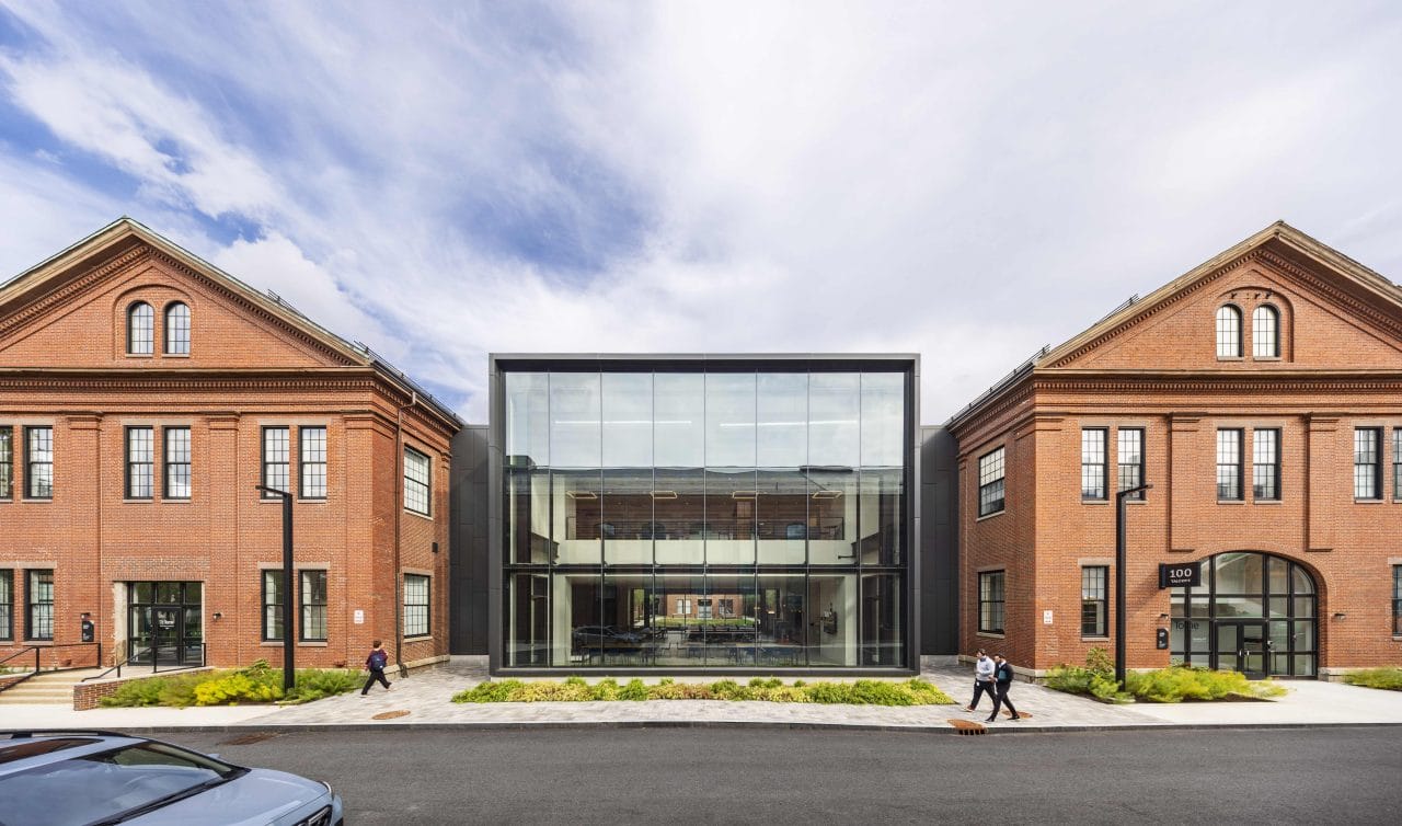4 Kingsbury Avenue anchors the edge of the new arrival court on Kingsbury Avenue. Located in a dense area of the campus, the new office and research laboratory facility was designed to feel light and encourage transparency, while the brick detailing on the first three floors harkens back to the campus’s historical structures. The facility’s glass façade encourages visual connections to the new arrival court, setting the building apart from its red-brick neighbors. 4 Kingsbury Avenue is LEED Gold certified and targeting Fitwel certification.