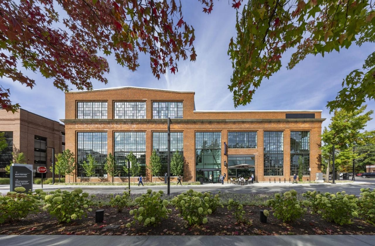 The Alexandria Center® for Life Science at the Arsenal on the Charles is a vibrant campus hugging the edge of the Charles River. To celebrate this environment, a 6,000-square-foot pavilion was added to the north face of the existing parking garage located on the west end of the campus. The new pavilion, which is designed to achieve net zero, is LEED Gold certified and targeting Fitwel certification.