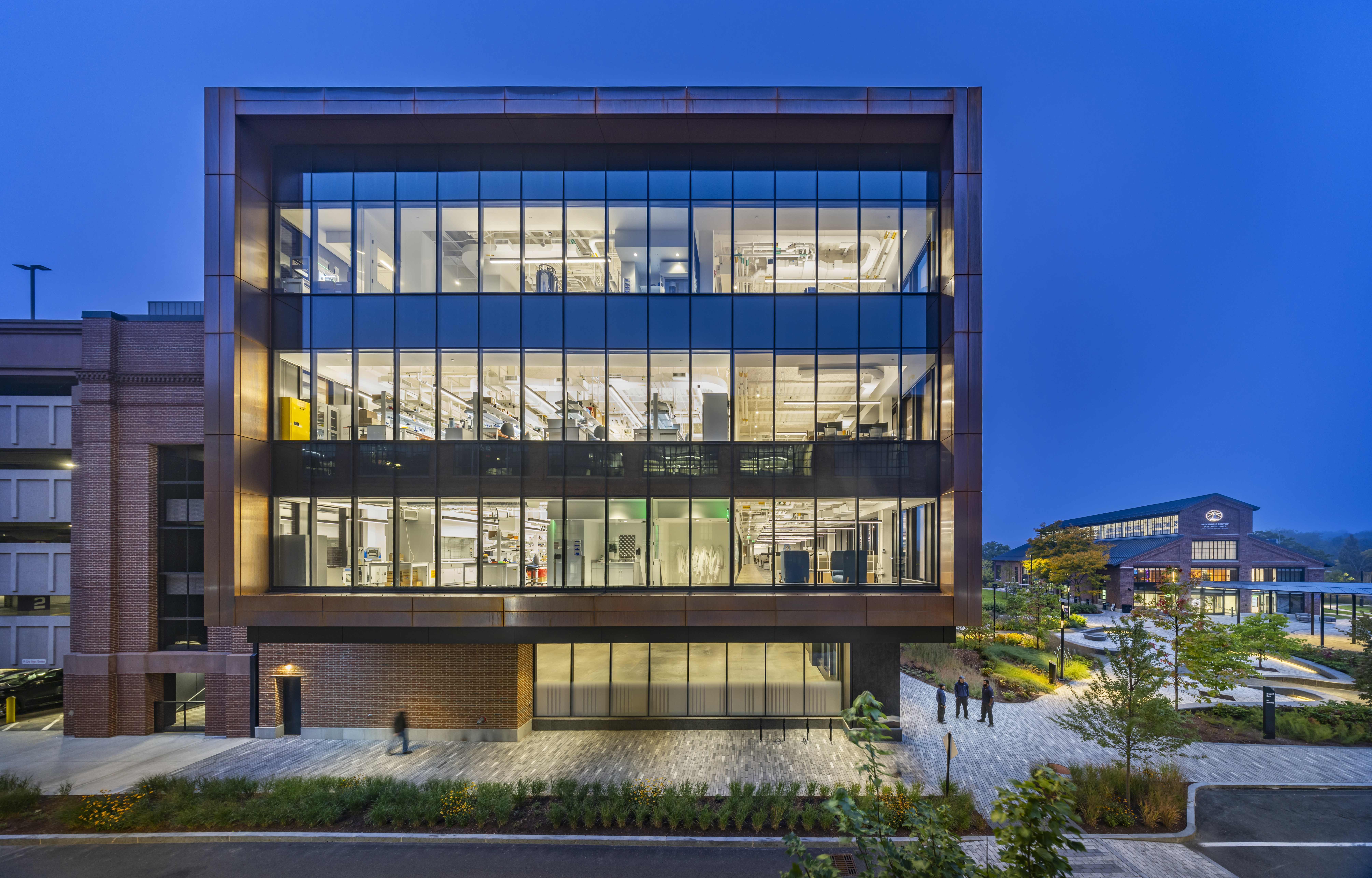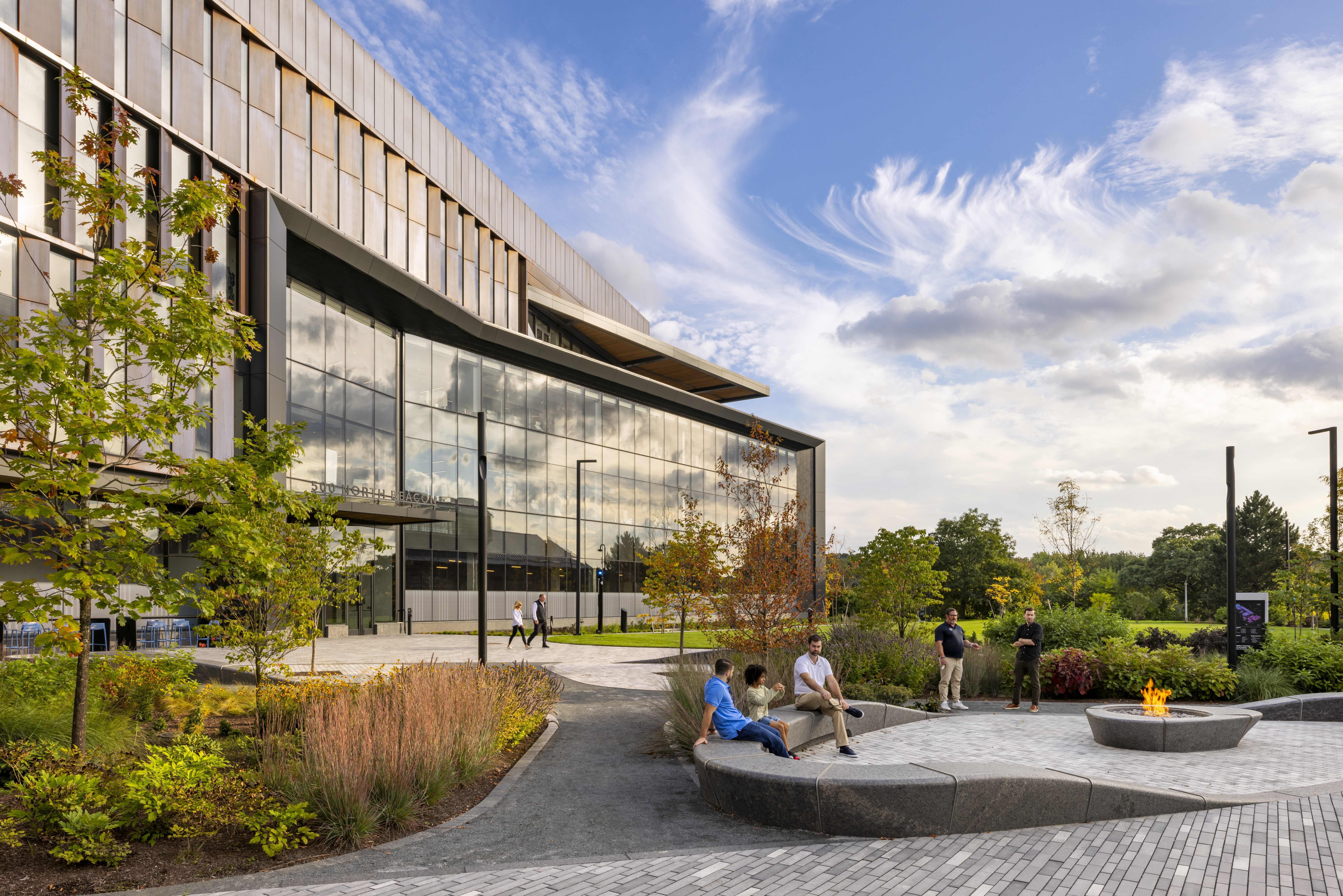 500 North Beacon Street celebrates the rich history of the campus while injecting the site with a contemporary aesthetic. The new office and research laboratory facility, which is LEED Gold certified and targeting Fitwel certification, consists of two main volumes: a four-story structure clad in vertical copper fins and a lower glass volume featuring a large fourth-floor terrace.