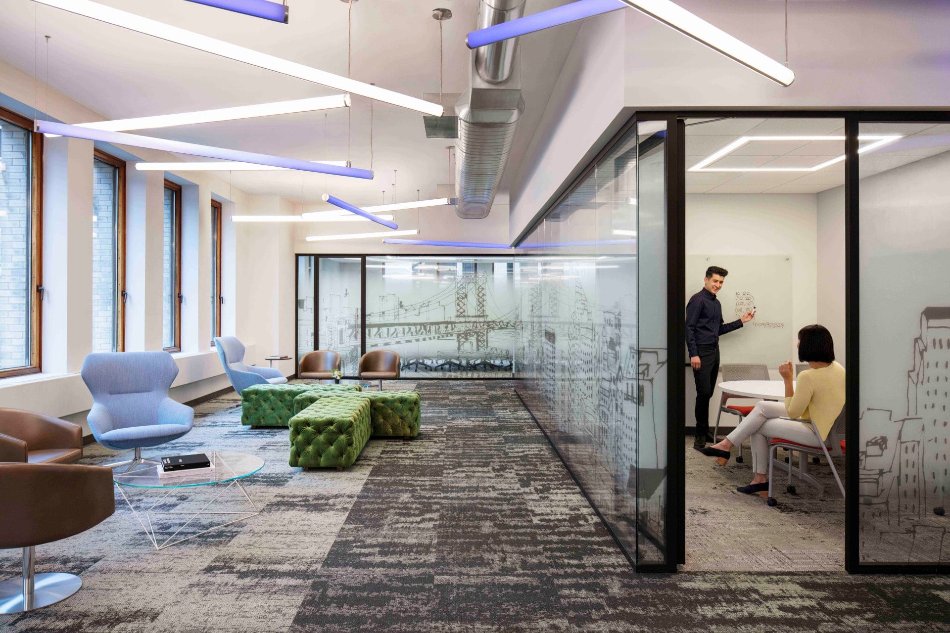 Collaboration and communication were key areas of focus. The space features an open floor plan, “break-out spaces,” and traditional conference rooms with state-of-the-art video conferencing equipment.