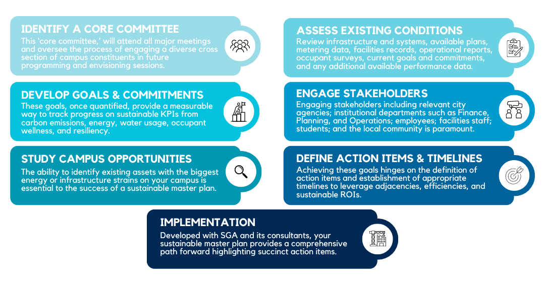 The foundation of a sustainable master plan lies in developing goals and targets aligned with the institution’s vision and mission. These goals, once quantified, provide a measurable way to track progress internally and to report it externally.